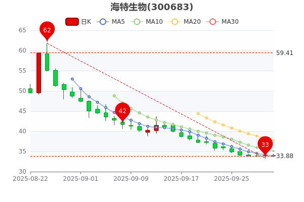 10月10日消息,海特生物5日內(nèi)股價下跌2.98%,該股最新報34.050元漲0.38%,成交1.12億元,換手率2.7%。