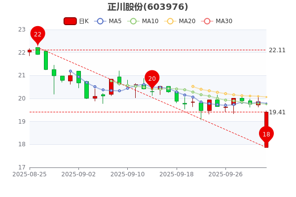 10月13日訊息,正川股份3日內(nèi)股價(jià)下跌0.2%,市值為29.27億元,跌2.27%,最新報(bào)19.360元。