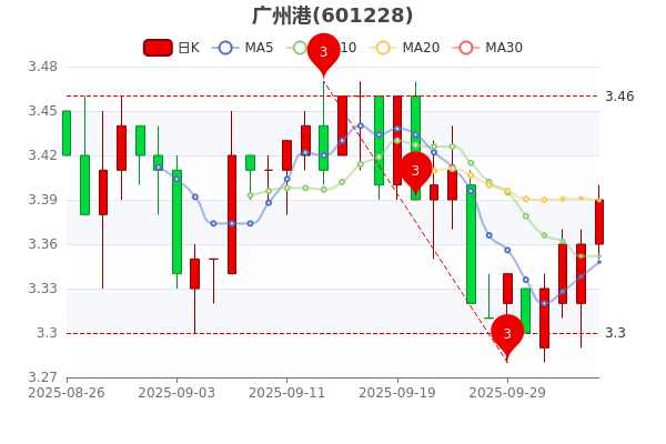 10月14日訊息,廣州港3日內(nèi)股價(jià)上漲0.89%,市值為255.01億元,漲0.89%,最新報(bào)3.380元。