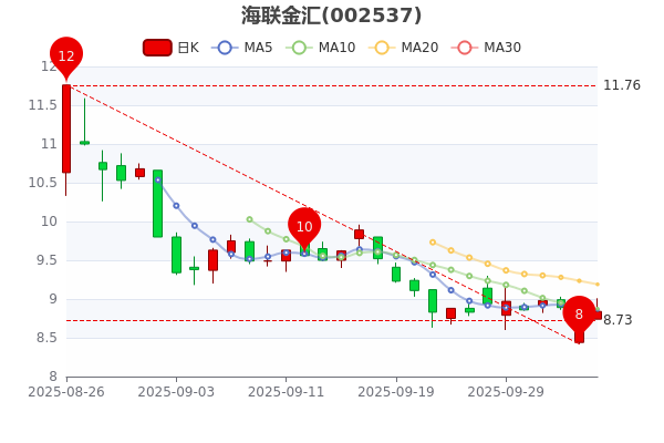 10月14日11時(shí)16分,海聯(lián)金匯(002537)今年來(lái)上漲34.14%,最新股價(jià)報(bào)8.840元,當(dāng)日最高價(jià)為9.01元,最低達(dá)8.74元,換手率2.42%,成交額2.51億元。