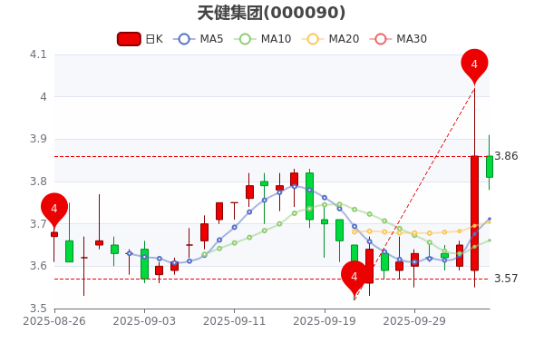 10月14日股市消息,天健集團(tuán)(000090)盤(pán)中報(bào)3.800元/股,跌1.3%。公司股價(jià)沖高至3.91元,最低達(dá)3.78元,換手率3.31%。