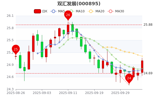 10月14日消息,雙匯發(fā)展最新報(bào)價(jià)24.980元,3日內(nèi)股價(jià)下跌0.08%;今年來(lái)漲幅下跌-5.1%,市盈率為17.35。