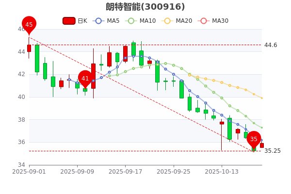 截至15時收盤,朗特智能(300916)目前跌3.13%,股價報35.910元,成交132.56萬手,成交金額4763.05萬元,換手率1.42%。