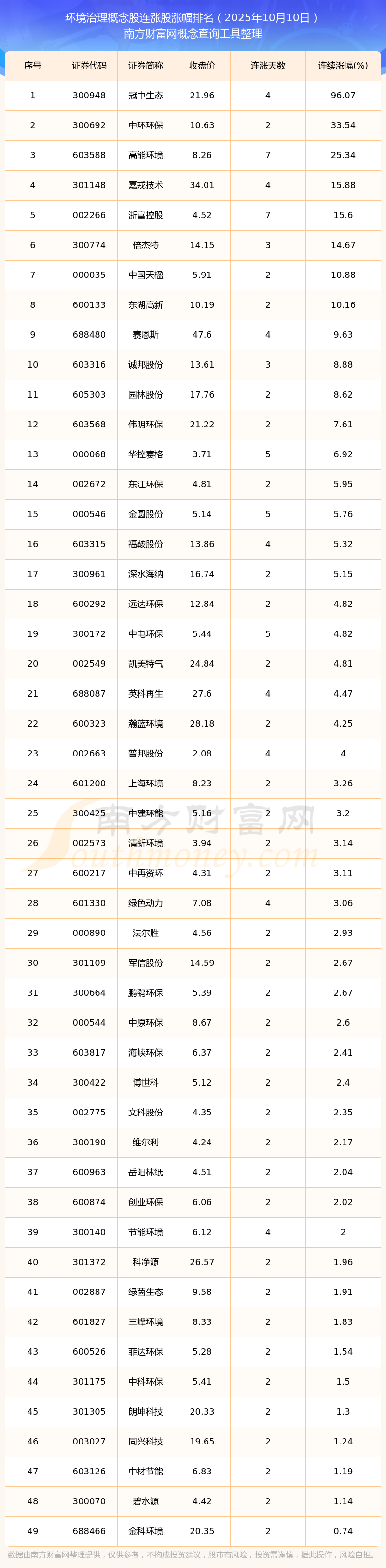根據(jù)南方財(cái)富網(wǎng)概念查詢工具數(shù)據(jù)統(tǒng)計(jì),截止2025年10月10日收盤,環(huán)境治理概念股共有49只個(gè)股實(shí)現(xiàn)連漲。其中連續(xù)漲幅較大的個(gè)股有冠中生態(tài)、中環(huán)環(huán)保、高能環(huán)境等,連續(xù)漲幅分別為96.07%、33.54%、25.34%。