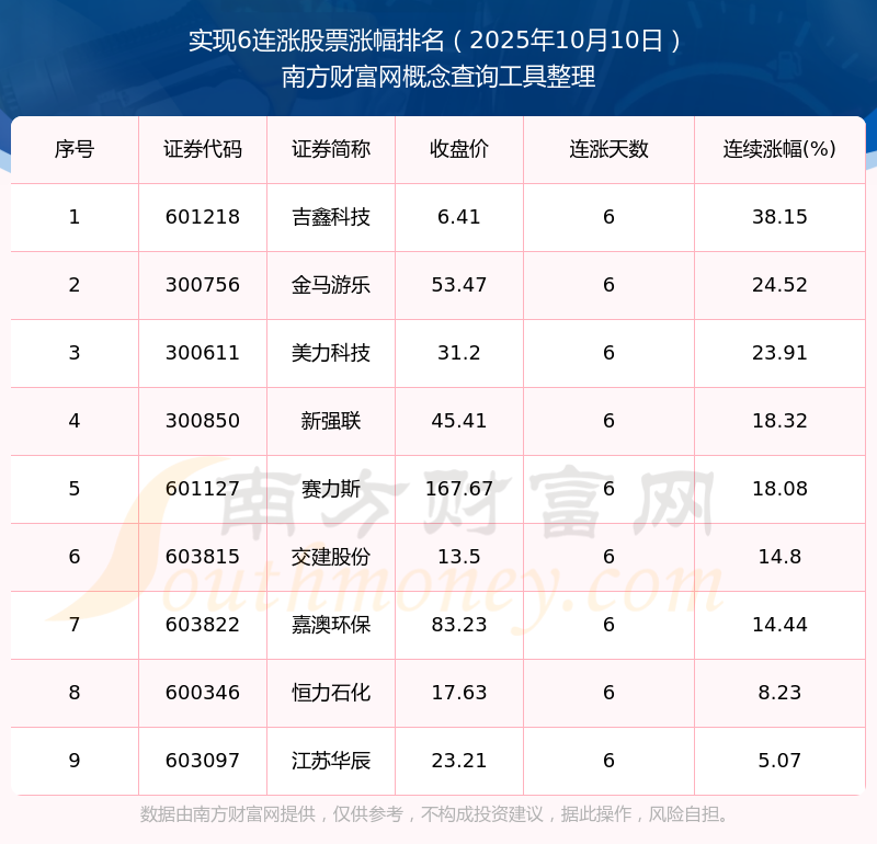根據(jù)南方財(cái)富網(wǎng)概念查詢(xún)工具數(shù)據(jù)統(tǒng)計(jì),截止2025年10月10日收盤(pán),共有9只個(gè)股實(shí)現(xiàn)6天連漲。其中連續(xù)漲幅較大的個(gè)股有吉鑫科技、金馬游樂(lè)、美力科技等,連續(xù)漲幅分別為38.15%、24.52%、23.91%。