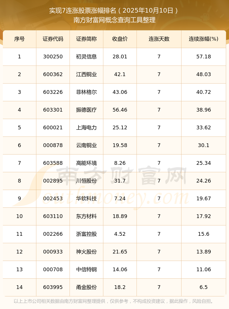 根據(jù)南方財富網(wǎng)概念查詢工具數(shù)據(jù)統(tǒng)計,截止2025年10月10日收盤,共有14只個股實現(xiàn)7天連漲。其中連續(xù)漲幅較大的個股有初靈信息、江西銅業(yè)、菲林格爾等,連續(xù)漲幅分別為57.18%、48.03%、40.72%。