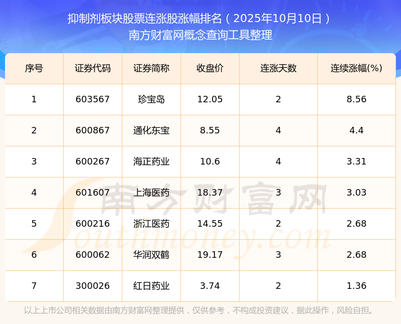 2025年10月10日抑制劑板塊股票連漲股漲幅排名