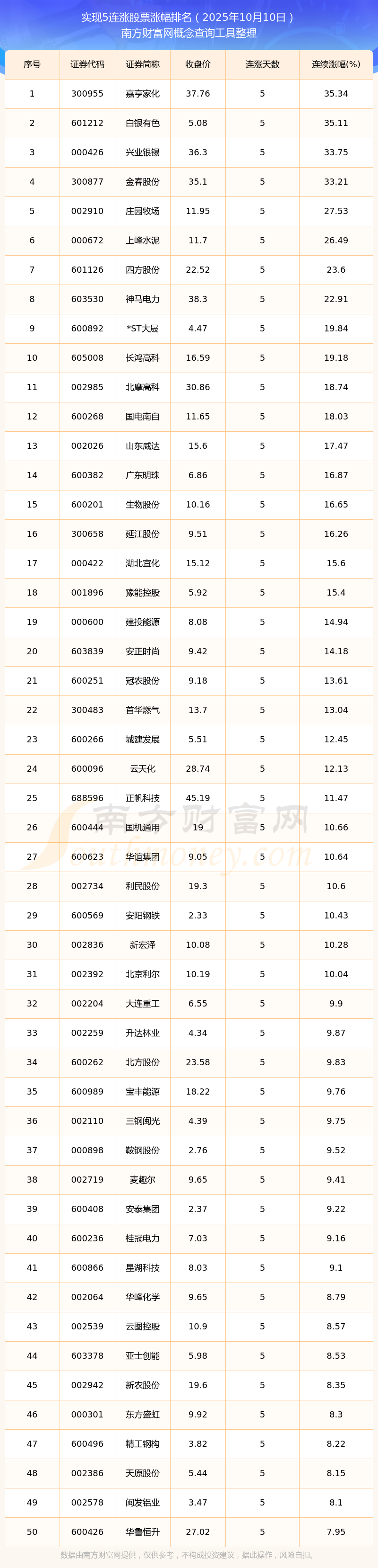 2025年10月10日實(shí)現(xiàn)5連漲股票漲幅排名