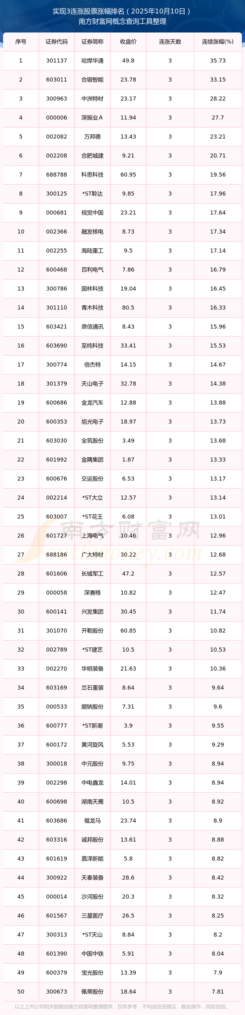 2025年10月10日實(shí)現(xiàn)3連漲股票漲幅排名