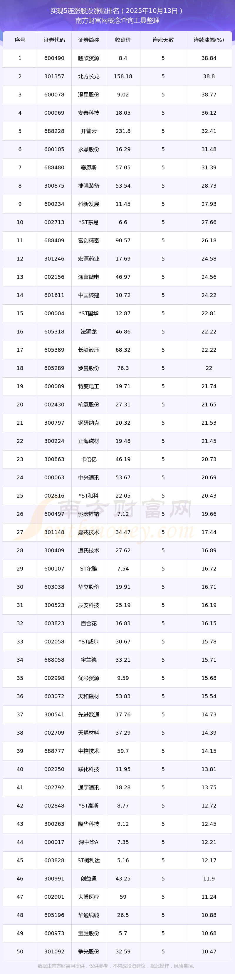 2025年10月13日實(shí)現(xiàn)5連漲股票漲幅排名