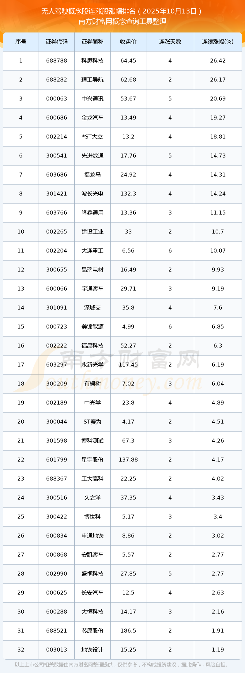 根據(jù)南方財(cái)富網(wǎng)概念查詢工具數(shù)據(jù)統(tǒng)計(jì),截止2025年10月13日收盤,無人駕駛概念股共有32只個(gè)股實(shí)現(xiàn)連漲。其中連續(xù)漲幅較大的個(gè)股有科思科技、理工導(dǎo)航、中興通訊等,連續(xù)漲幅分別為26.42%、26.17%、20.69%。