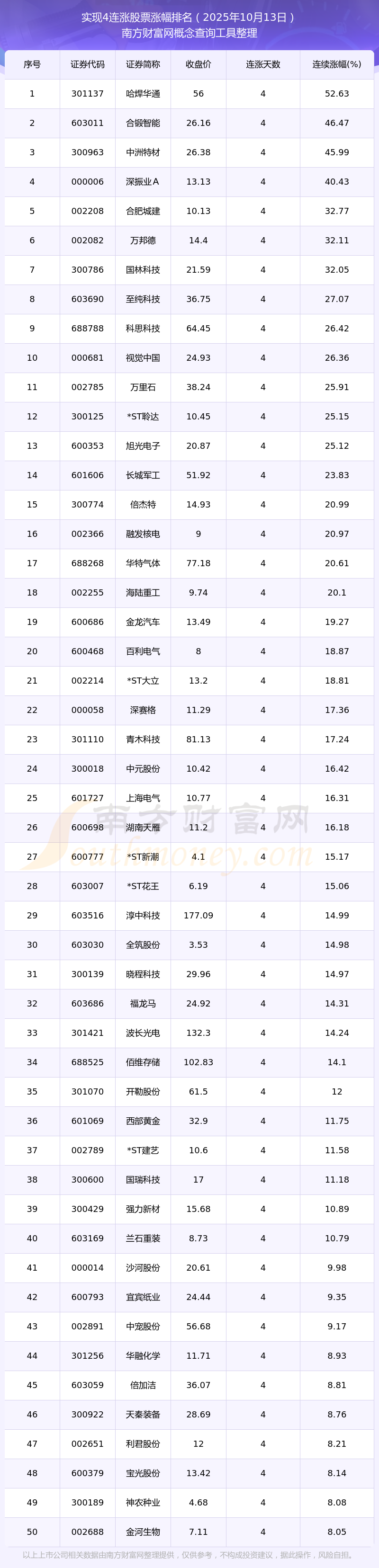 2025年10月13日實現(xiàn)4連漲股票漲幅排名