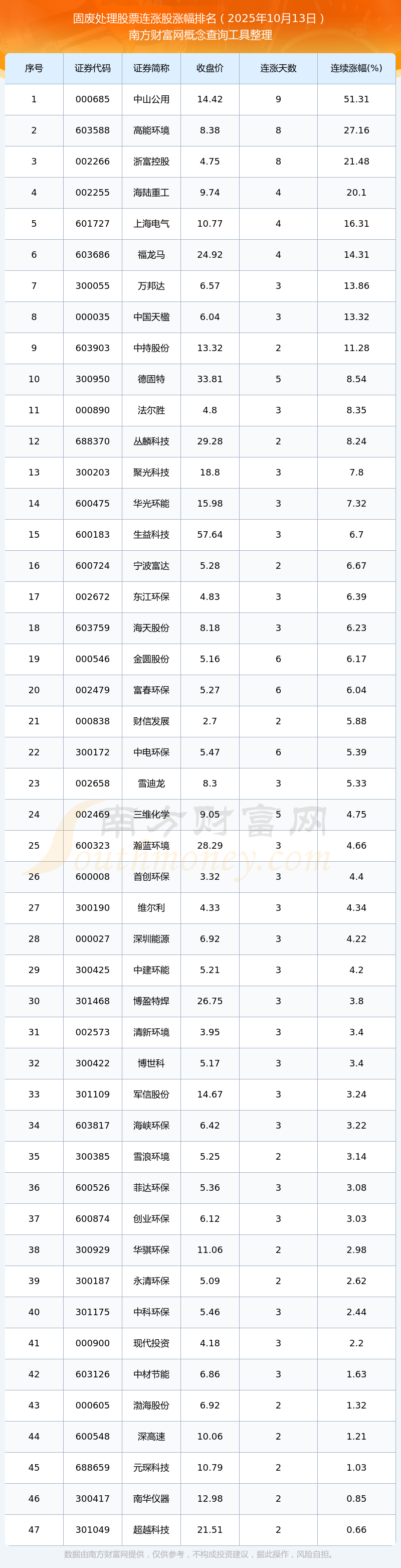 2025年10月13日固廢處理股票連漲股漲幅排名