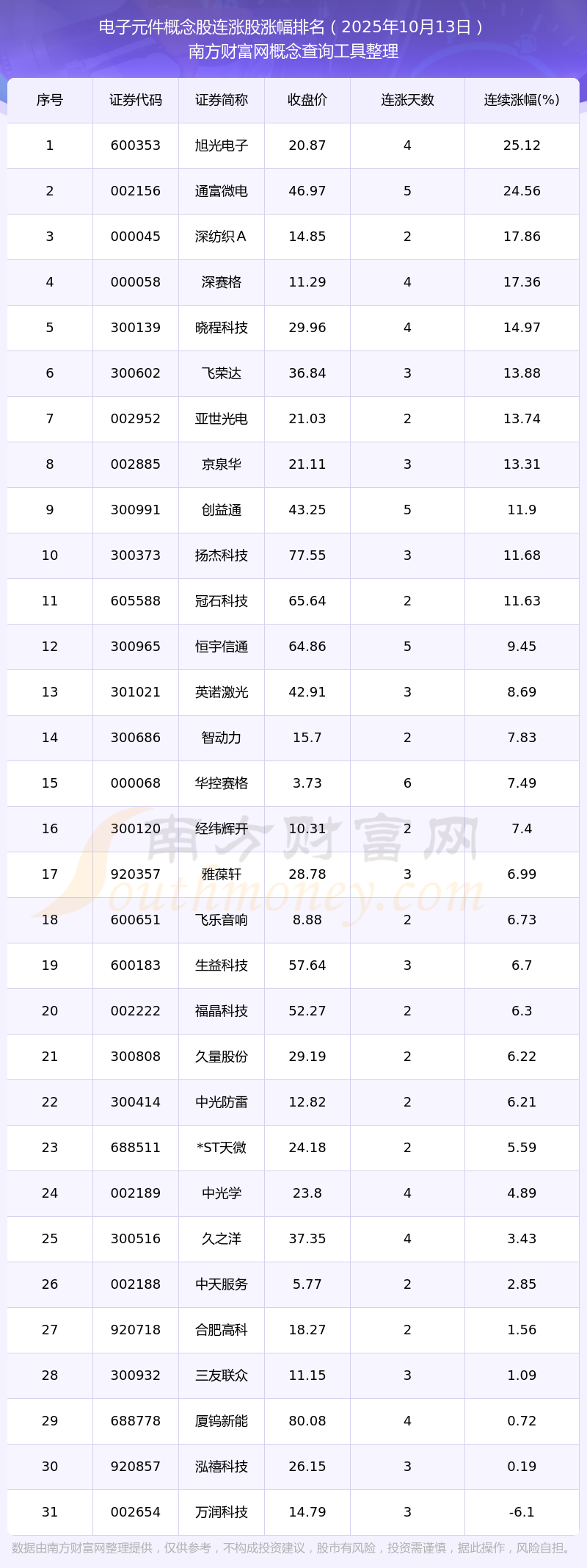 2025年10月13日電子元件概念股連漲股漲幅排名
