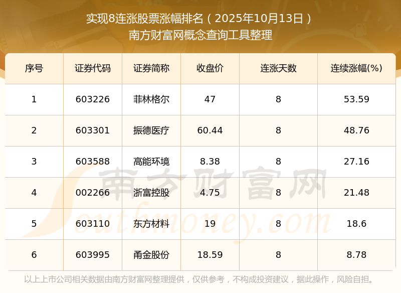 根據(jù)南方財富網(wǎng)概念查詢工具數(shù)據(jù)統(tǒng)計,截止2025年10月13日收盤,共有6只個股實現(xiàn)8天連漲。其中連續(xù)漲幅較大的個股有菲林格爾、振德醫(yī)療、高能環(huán)境等,連續(xù)漲幅分別為53.59%、48.76%、27.16%。