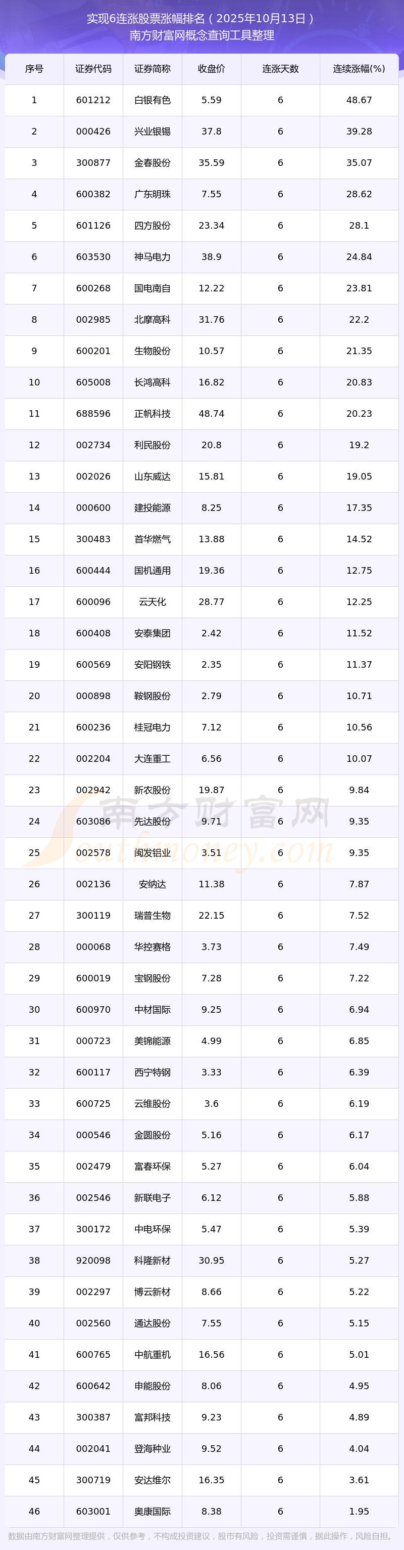 根據(jù)南方財(cái)富網(wǎng)概念查詢工具數(shù)據(jù)統(tǒng)計(jì),截止2025年10月13日收盤,共有46只個(gè)股實(shí)現(xiàn)6天連漲。其中連續(xù)漲幅較大的個(gè)股有白銀有色、興業(yè)銀錫、金春股份等,連續(xù)漲幅分別為48.67%、39.28%、35.07%。
