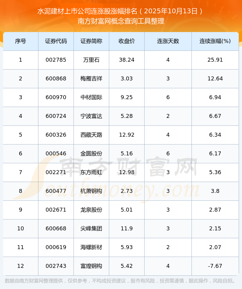 2025年10月13日水泥建材上市公司連漲股漲幅排名