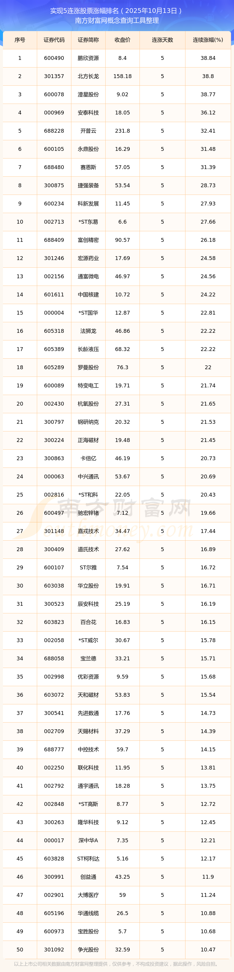 2025年10月13日實現(xiàn)5連漲股票漲幅排名