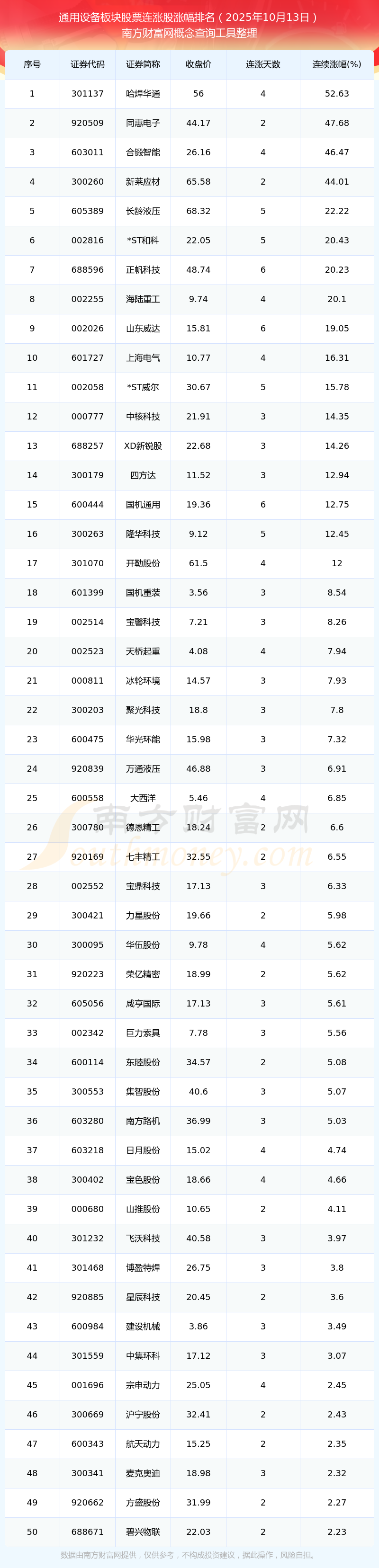 2025年10月13日通用設(shè)備板塊股票連漲股漲幅排名