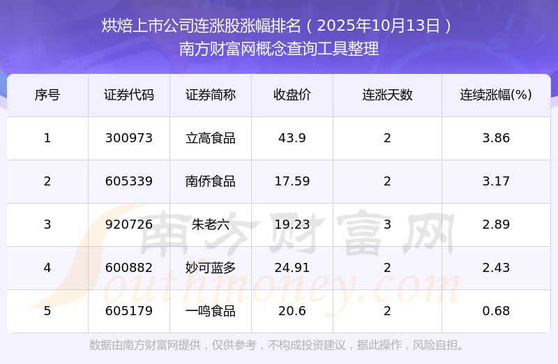 2025年10月13日烘焙上市公司連漲股漲幅排名