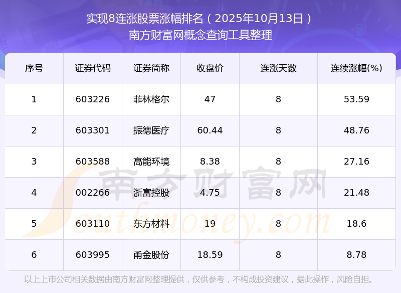 根據(jù)南方財(cái)富網(wǎng)概念查詢工具數(shù)據(jù)統(tǒng)計(jì),截止2025年10月13日收盤,共有6只個(gè)股實(shí)現(xiàn)8天連漲。其中連續(xù)漲幅較大的個(gè)股有菲林格爾、振德醫(yī)療、高能環(huán)境等,連續(xù)漲幅分別為53.59%、48.76%、27.16%。