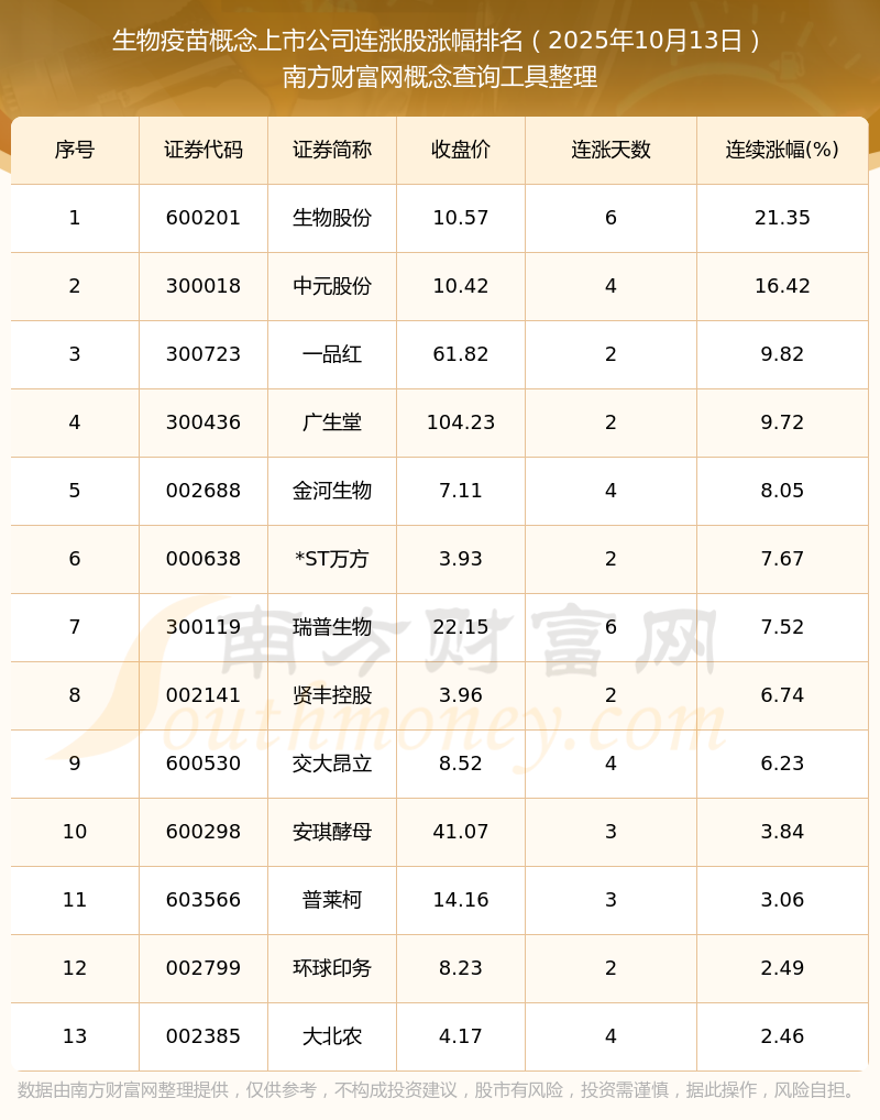 2025年10月13日生物疫苗概念上市公司連漲股漲幅排名