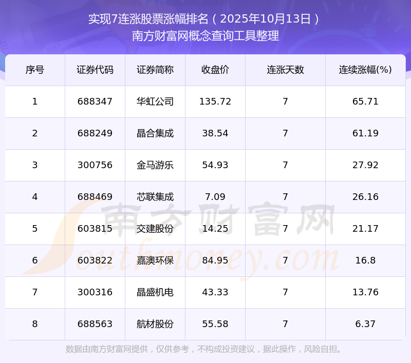 根據(jù)南方財(cái)富網(wǎng)概念查詢工具數(shù)據(jù)統(tǒng)計(jì),截止2025年10月13日收盤,共有8只個(gè)股實(shí)現(xiàn)7天連漲。其中連續(xù)漲幅較大的個(gè)股有華虹公司、晶合集成、金馬游樂等,連續(xù)漲幅分別為65.71%、61.19%、27.92%。