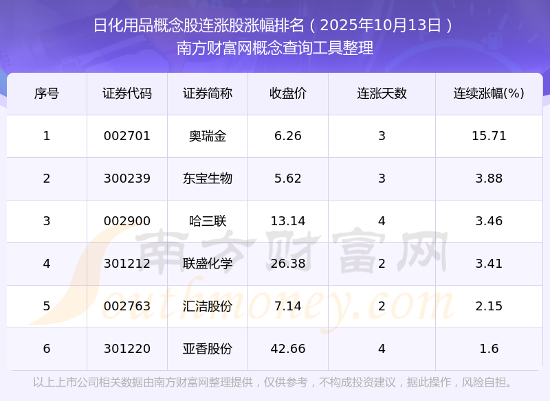2025年10月13日日化用品概念股連漲股漲幅排名
