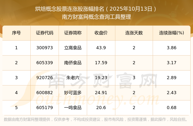 2025年10月13日烘焙概念股票連漲股漲幅排名