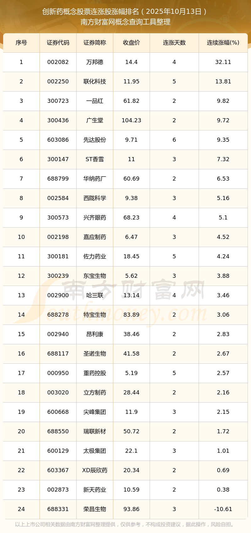2025年10月13日創(chuàng)新藥概念股票連漲股漲幅排名