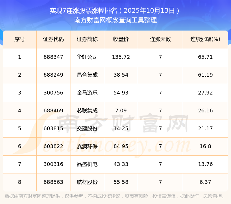 2025年10月13日實(shí)現(xiàn)7連漲股票漲幅排名