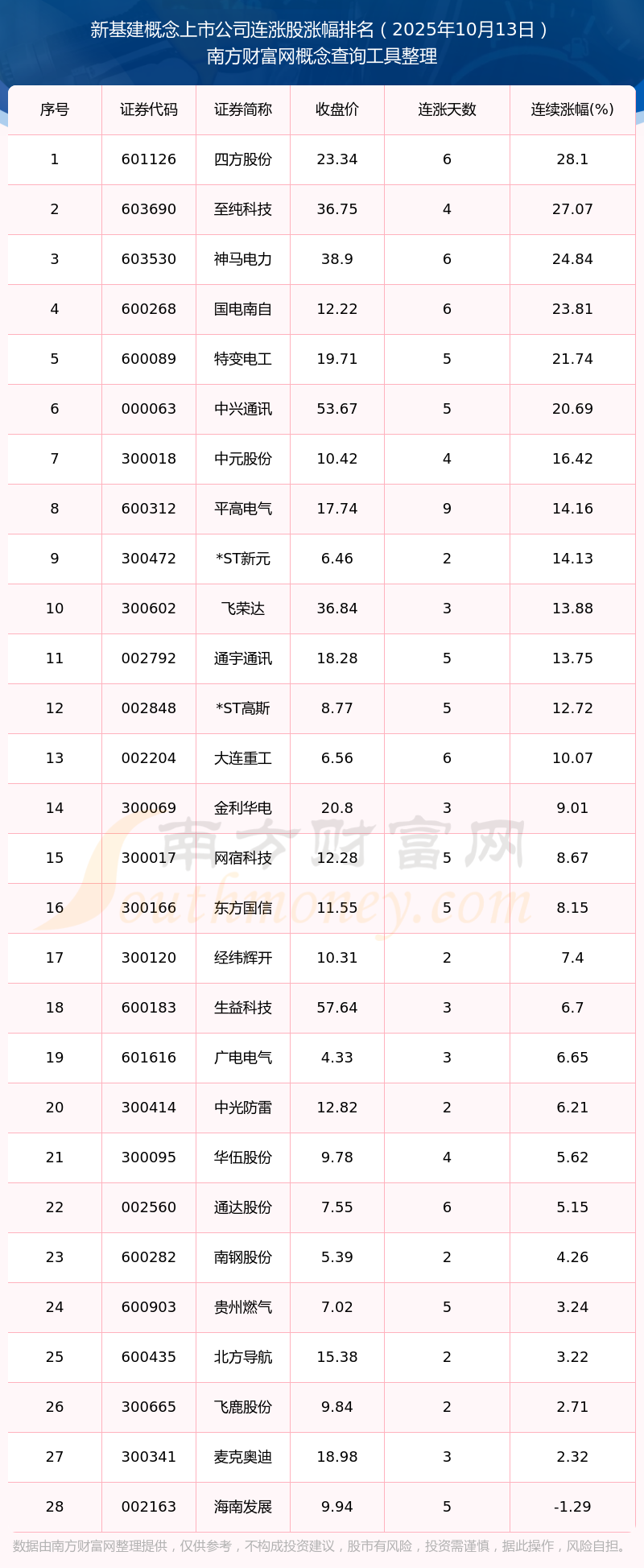 2025年10月13日新基建概念上市公司連漲股漲幅排名