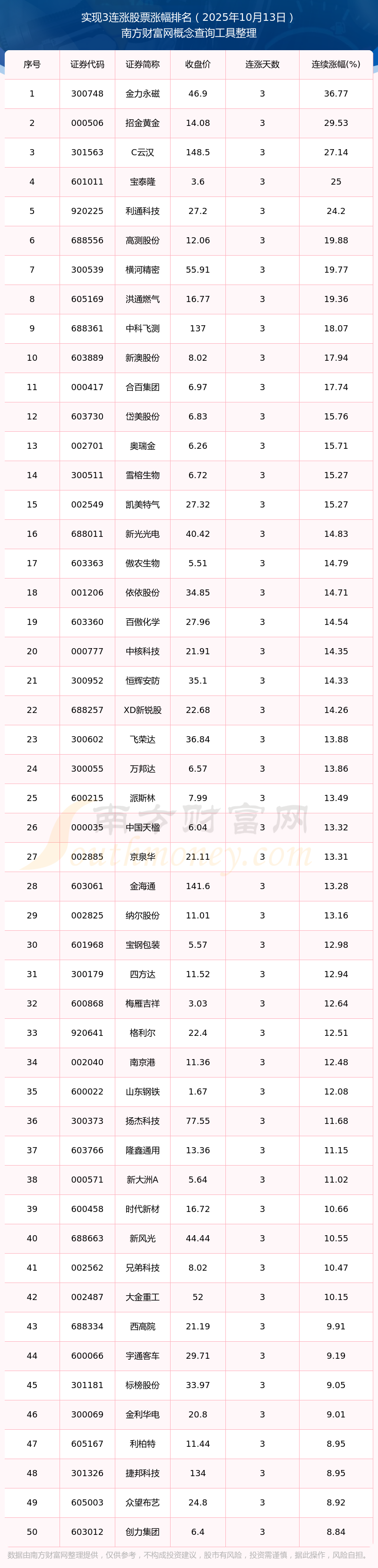 根據(jù)南方財富網(wǎng)概念查詢工具數(shù)據(jù)統(tǒng)計,截止2025年10月13日收盤,共有259只個股實現(xiàn)3天連漲。其中連續(xù)漲幅較大的個股有金力永磁、招金黃金、C云漢等,連續(xù)漲幅分別為36.77%、29.53%、27.14%。
