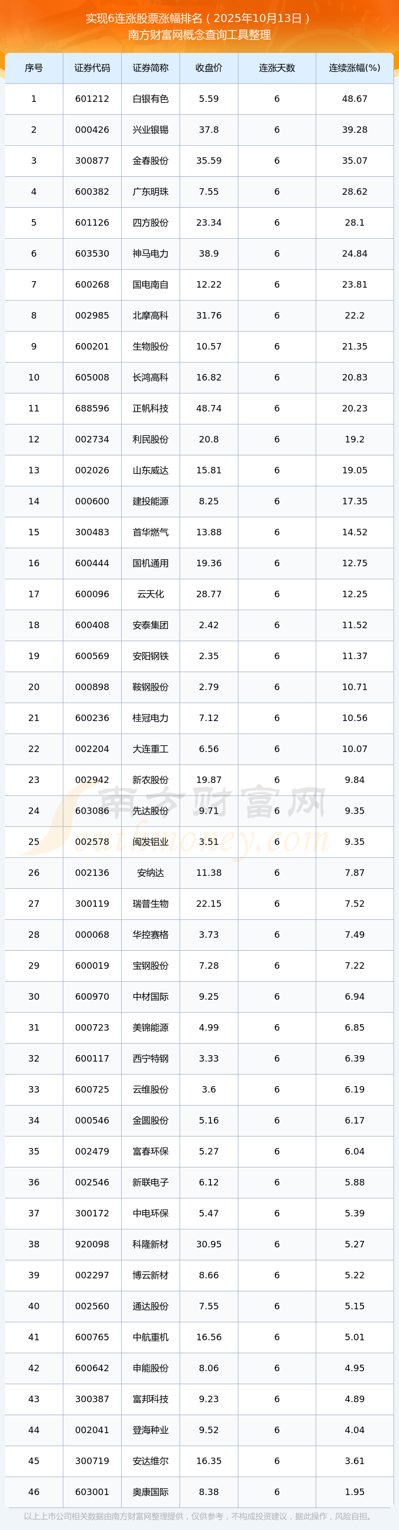 根據(jù)南方財(cái)富網(wǎng)概念查詢工具數(shù)據(jù)統(tǒng)計(jì),截止2025年10月13日收盤,共有46只個股實(shí)現(xiàn)6天連漲。其中連續(xù)漲幅較大的個股有白銀有色、興業(yè)銀錫、金春股份等,連續(xù)漲幅分別為48.67%、39.28%、35.07%。