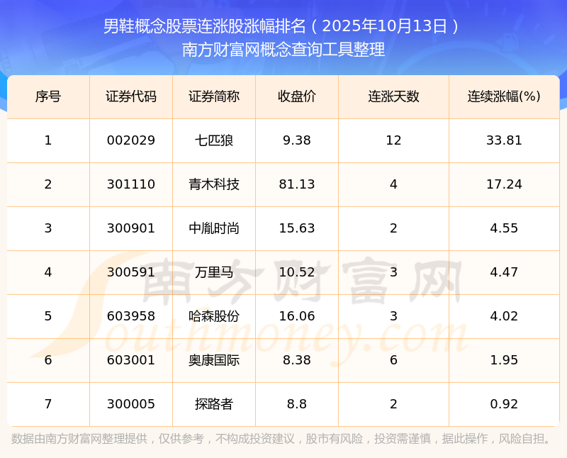 2025年10月13日男鞋概念股票連漲股漲幅排名