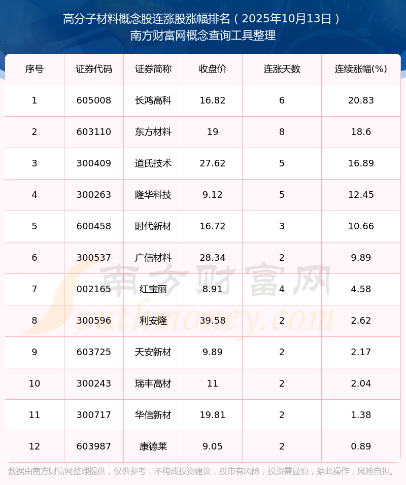 2025年10月13日高分子材料概念股連漲股漲幅排名