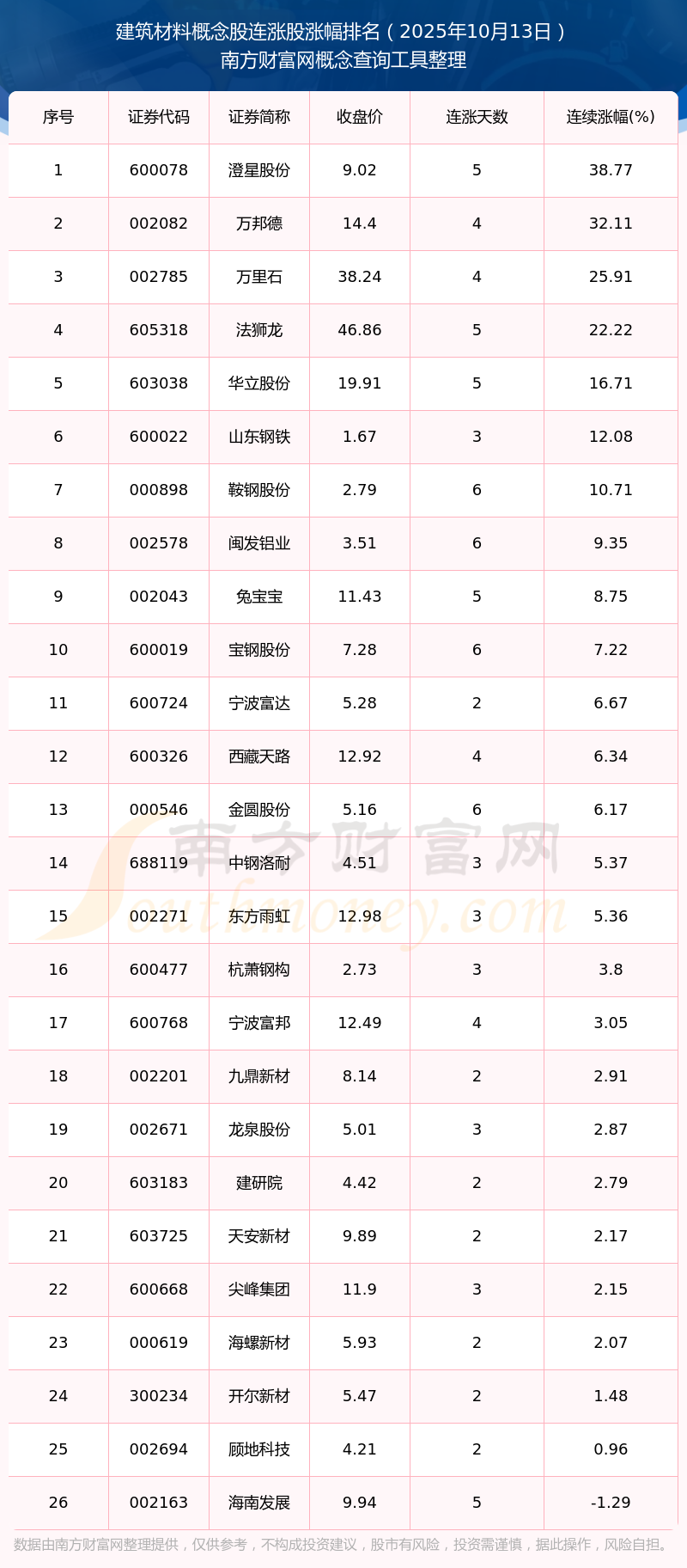 根據南方財富網概念查詢工具數據統(tǒng)計,截止2025年10月13日收盤,建筑材料概念股共有26只個股實現連漲。其中連續(xù)漲幅較大的個股有澄星股份、萬邦德、萬里石等,連續(xù)漲幅分別為38.77%、32.11%、25.91%。