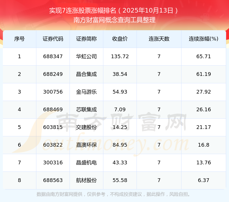 2025年10月13日實現(xiàn)7連漲股票漲幅排名