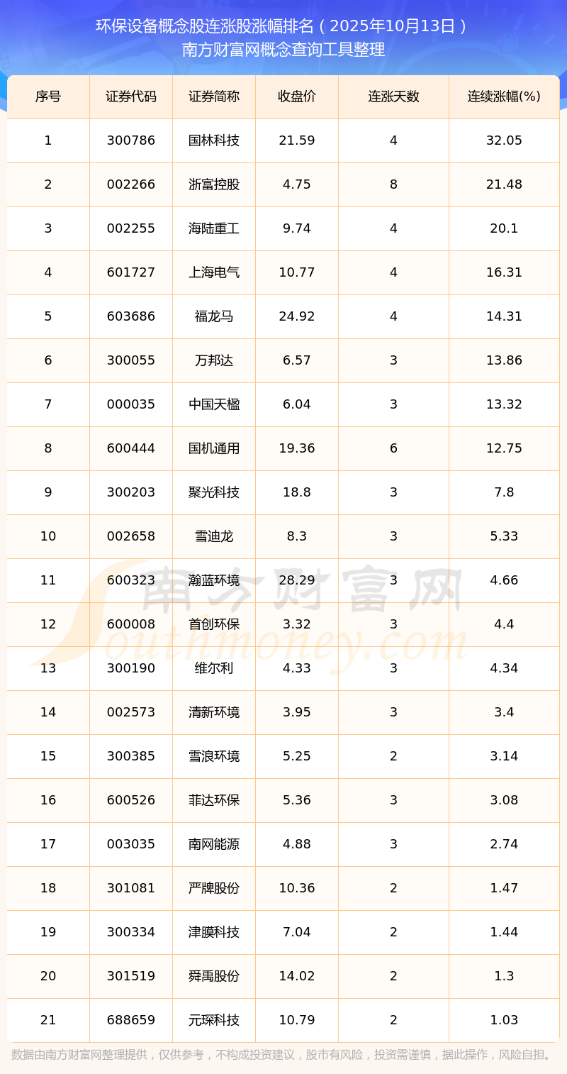 根據(jù)南方財富網(wǎng)概念查詢工具數(shù)據(jù)統(tǒng)計,截止2025年10月13日收盤,環(huán)保設(shè)備概念股共有21只個股實現(xiàn)連漲。其中連續(xù)漲幅較大的個股有國林科技、浙富控股、海陸重工等,連續(xù)漲幅分別為32.05%、21.48%、20.10%。