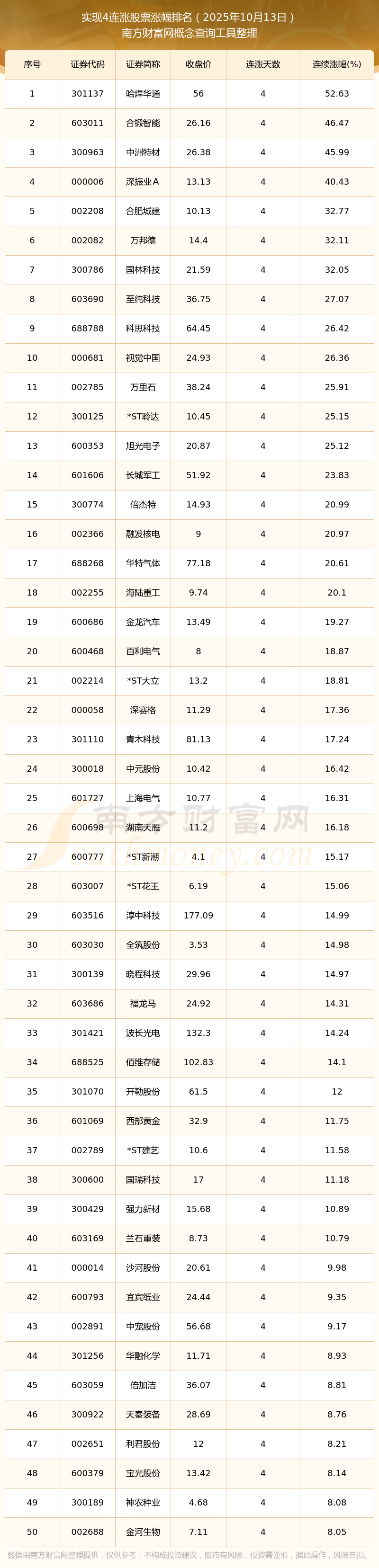 2025年10月13日實現(xiàn)4連漲股票漲幅排名