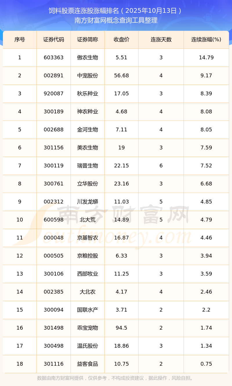 根據(jù)南方財富網(wǎng)概念查詢工具數(shù)據(jù)統(tǒng)計,截止2025年10月13日收盤,飼料股票共有18只個股實現(xiàn)連漲。其中連續(xù)漲幅較大的個股有傲農(nóng)生物、中寵股份、秋樂種業(yè)等,連續(xù)漲幅分別為14.79%、9.17%、8.39%。