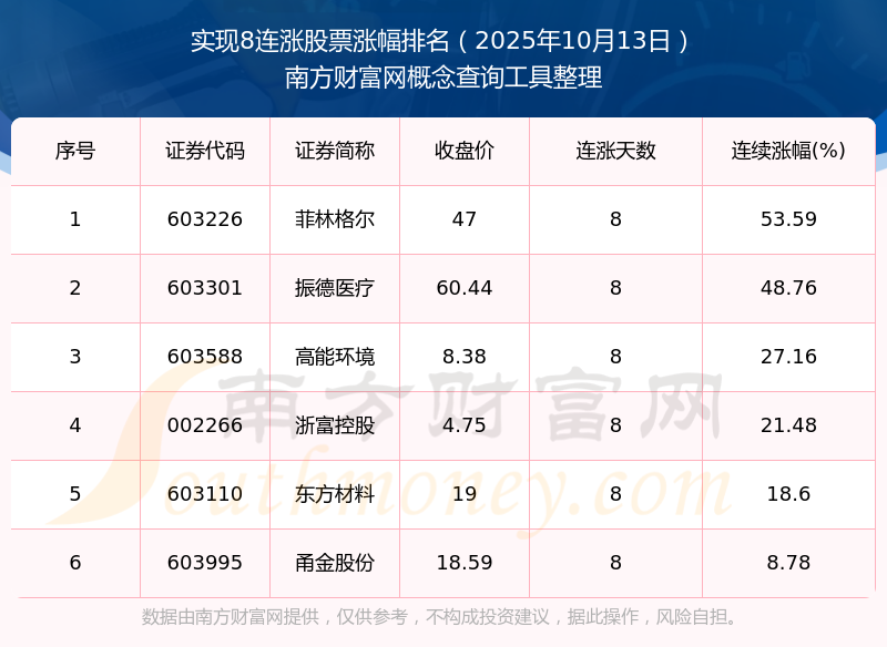 根據(jù)南方財(cái)富網(wǎng)概念查詢(xún)工具數(shù)據(jù)統(tǒng)計(jì),截止2025年10月13日收盤(pán),共有6只個(gè)股實(shí)現(xiàn)8天連漲。其中連續(xù)漲幅較大的個(gè)股有菲林格爾、振德醫(yī)療、高能環(huán)境等,連續(xù)漲幅分別為53.59%、48.76%、27.16%。
