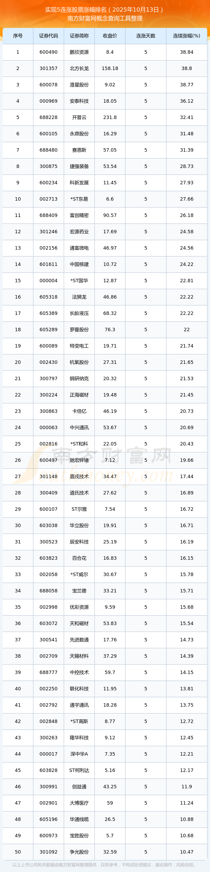 2025年10月13日實現(xiàn)5連漲股票漲幅排名