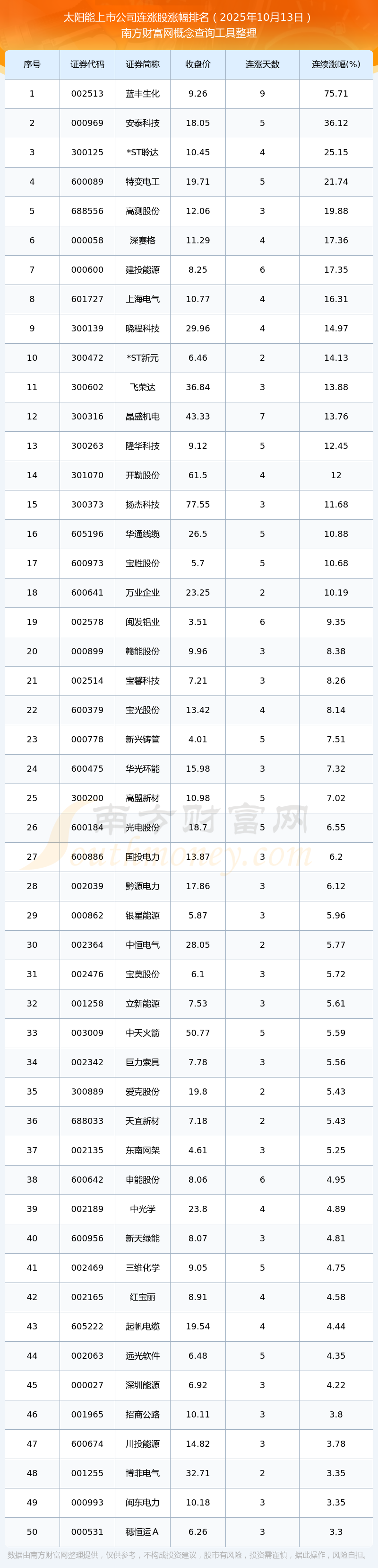 2025年10月13日太陽(yáng)能上市公司連漲股漲幅排名