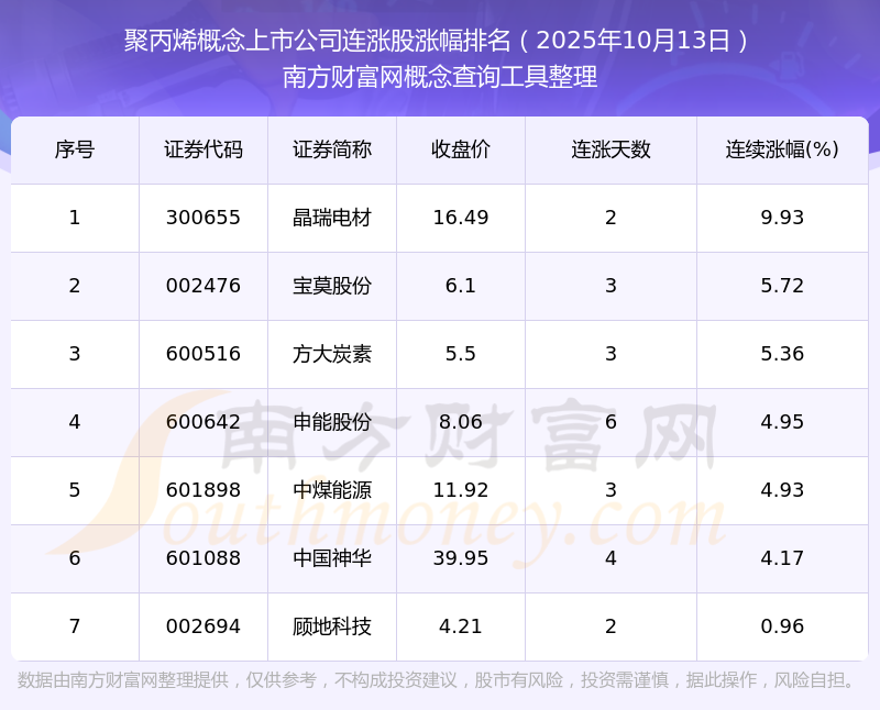 2025年10月13日聚丙烯概念上市公司連漲股票漲幅排名