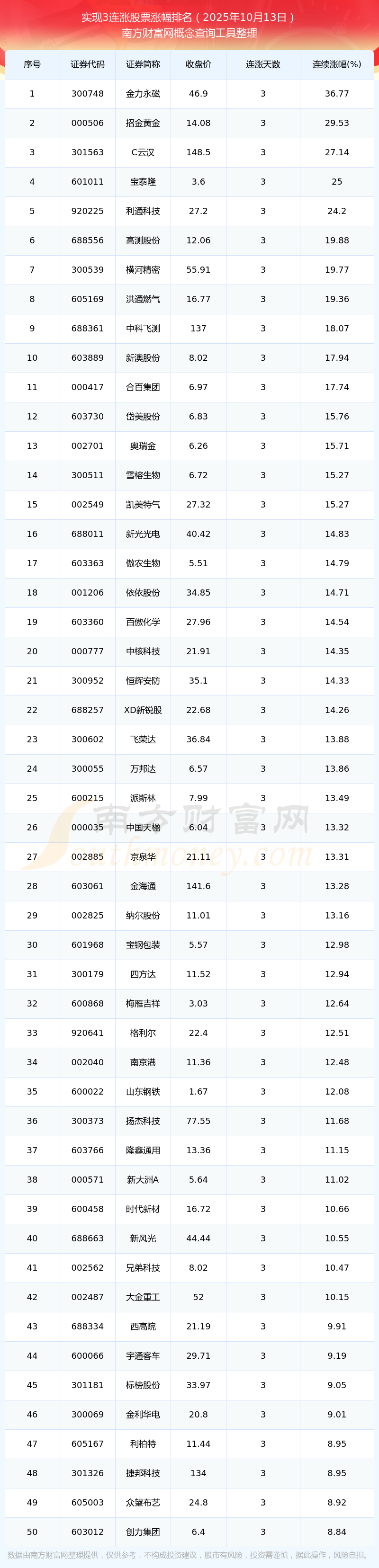 2025年10月13日實(shí)現(xiàn)3連漲股票漲幅排名