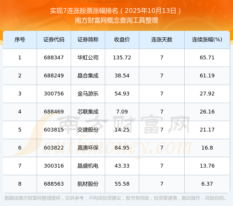 2025年10月13日實現(xiàn)7連漲股票漲幅排名