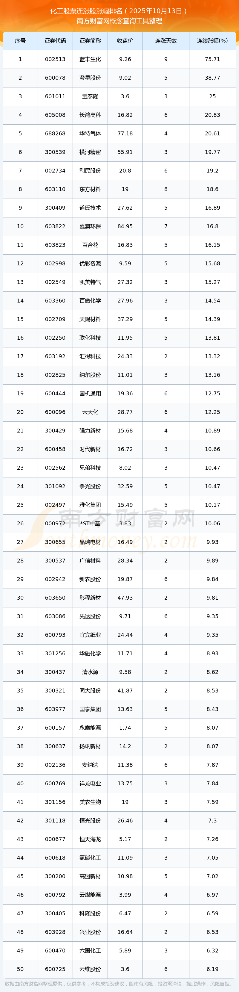 2025年10月13日化工股票連漲股漲幅排名