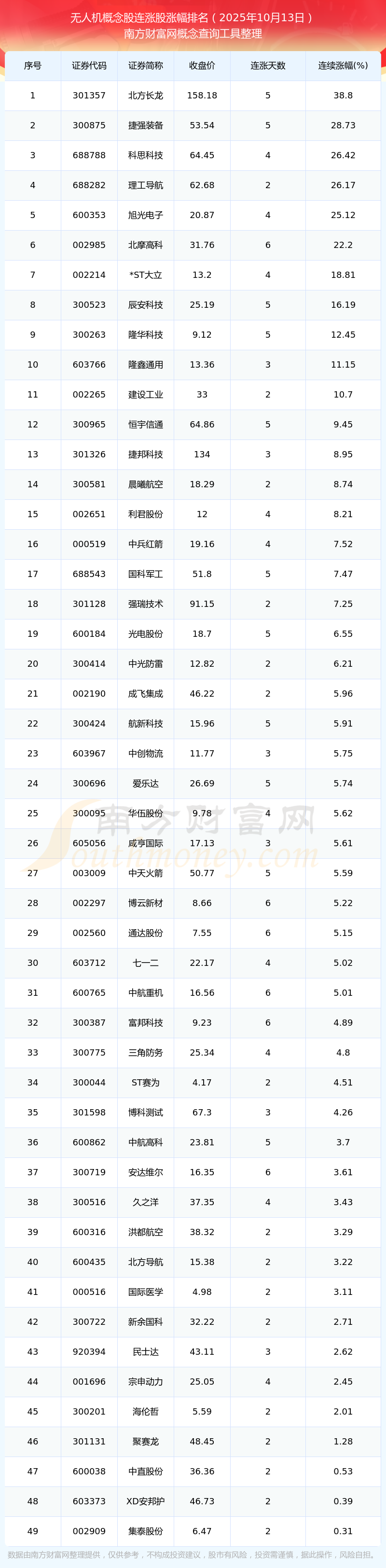 2025年10月13日無(wú)人機(jī)概念股連漲股漲幅排名