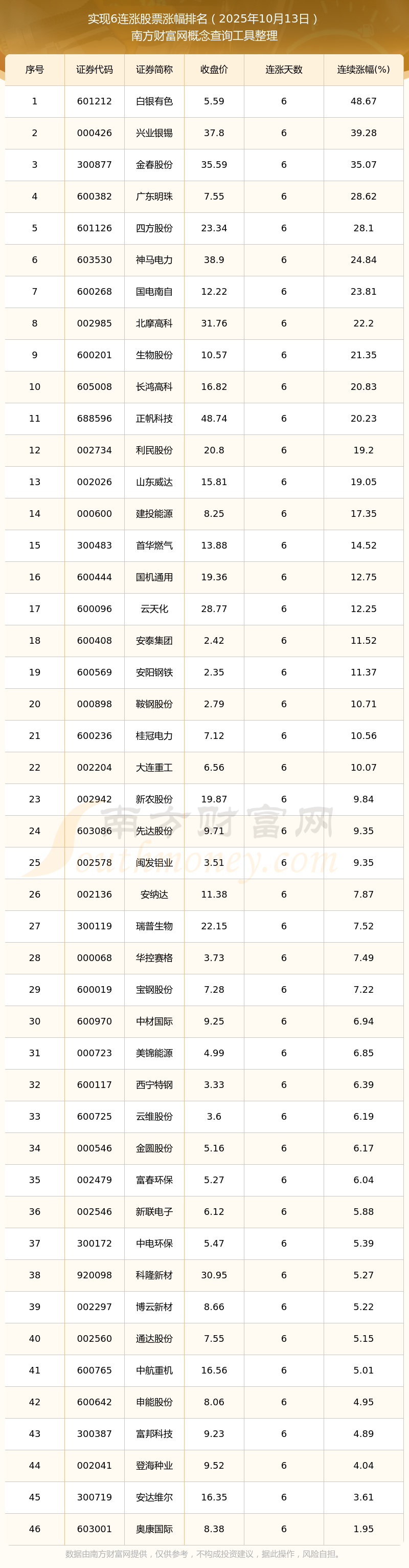 根據(jù)南方財(cái)富網(wǎng)概念查詢工具數(shù)據(jù)統(tǒng)計(jì),截止2025年10月13日收盤,共有46只個(gè)股實(shí)現(xiàn)6天連漲。其中連續(xù)漲幅較大的個(gè)股有白銀有色、興業(yè)銀錫、金春股份等,連續(xù)漲幅分別為48.67%、39.28%、35.07%。